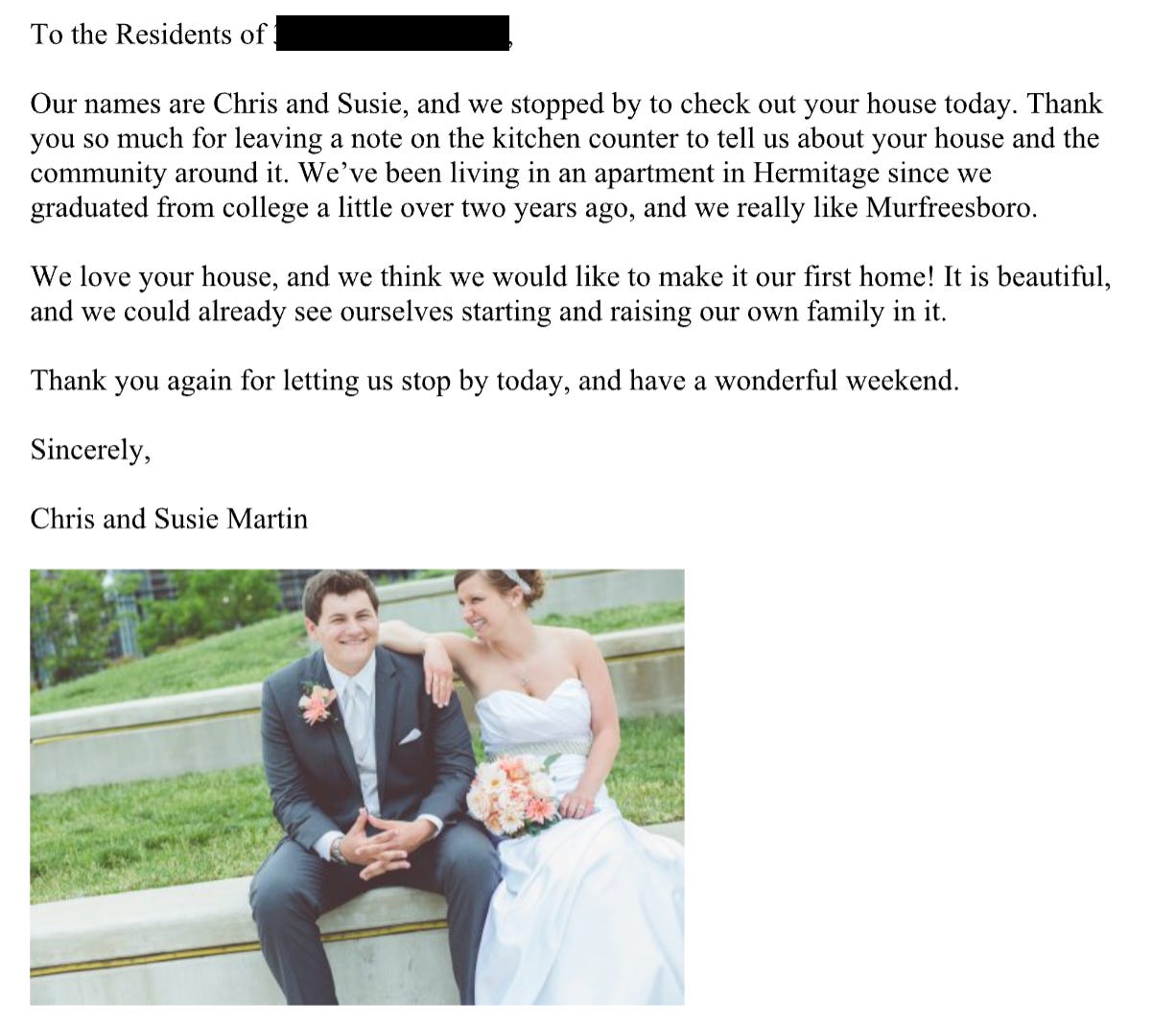 Eventually, based on our new friends the Smiths living in Murfreesboro1 and the fact that Murfreesboro more and better houses available in our budget range, I was able to convince Susie that we should zero in on Murfreesboro.